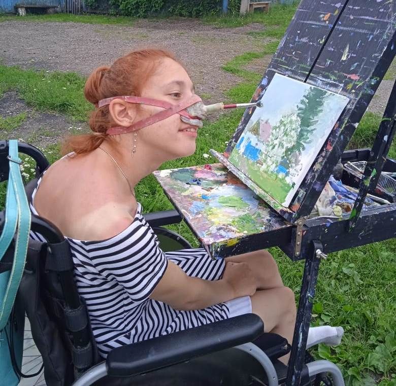 «Чтобы дочь могла рисовать, пару лет назад я ей придумала специальную насадку на резиночках. Эта насадка крепится за голову. Таким образом, Алена пишет свои картины носом.